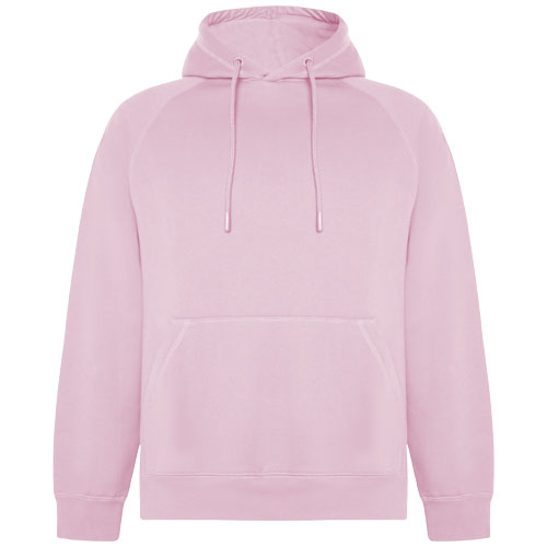 Unisex hoodie in organic cotton and recycled polyester. Kangaroo style pocket. Single jersey lining in hood. Round adjustable drawcord and embroidered eyelets. Cuffs and waistband in 2×1 ribbed fabric. Removable label. Individual recycled packing. The male model is 185 cm and is wearing size L, and the female model is 168 cm and is wearing size S.